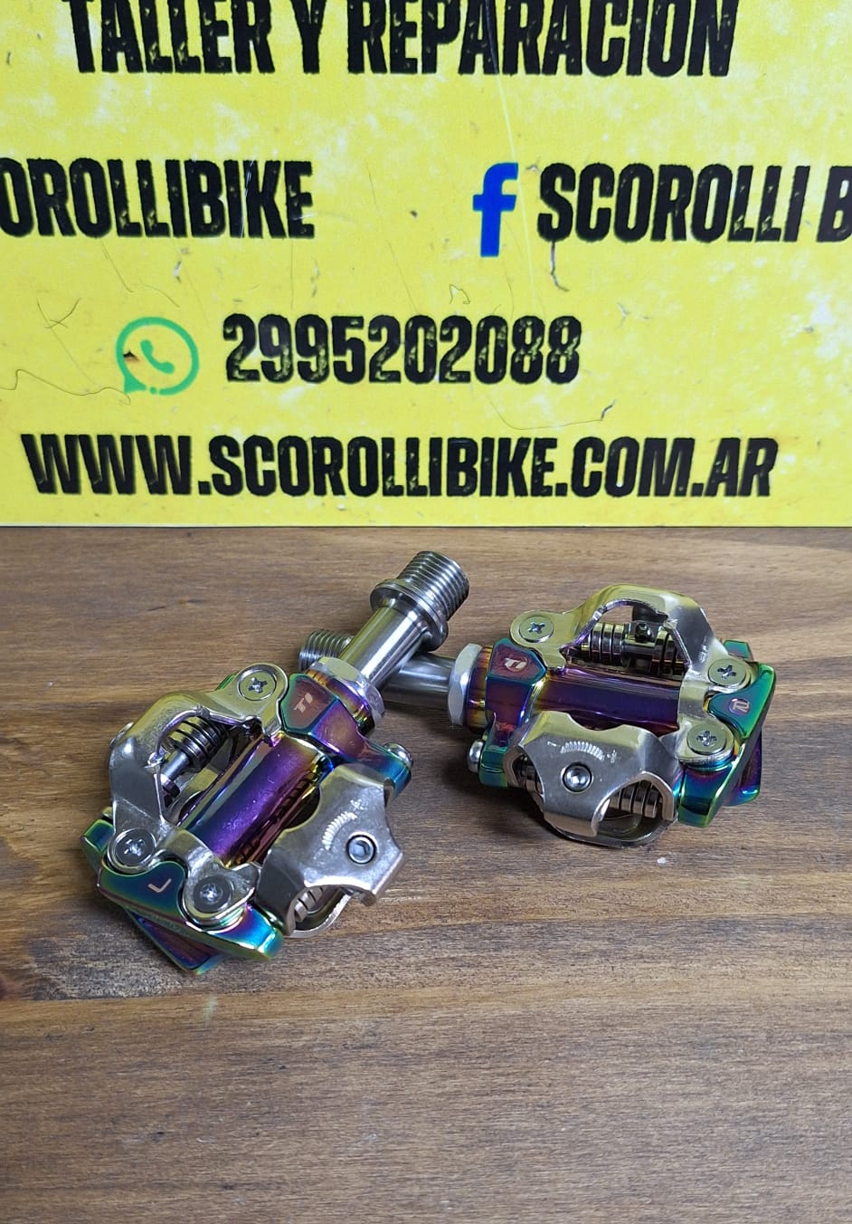 Pedales Awa mtb con traba aluminio y titanio tornasolado